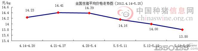 5 月 19 日 -5 月 25 日,全國生豬平均價格為 13.80 元 / ㎏,較上周下滑了 1.43 %,較去年同期下滑了 18.29 %。