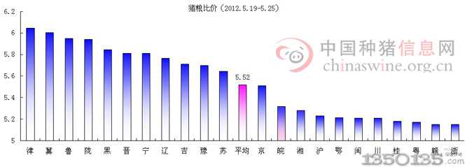 本周 豬糧比價為 5.52:1 ,較上周小幅回落(上周豬糧比價為 5.62 :1 ),天津地區豬糧比價最高,為 6.04:1 ,浙江豬糧比價最低,為 5.15:1 。