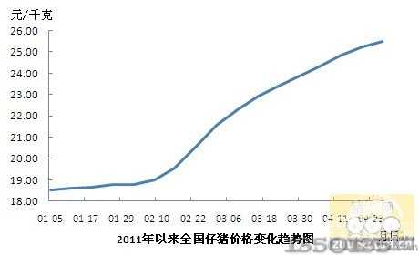 農業部日前發布的2011年04月27日全國470個農村集貿市場仔豬平均價格為25.51元/千克,仔豬價格連續上漲12周,較上周同期環比上漲1.03%,與去年仔豬同期水平相比上漲71.55%。 農業部日前發布的2011年04月27日全國470個農村集貿市場仔豬平均價格為25.51元/千克,仔豬價格連續上漲12周,較上周同期環比上漲1.03%,與去年仔豬同期水平相比上漲71.55%(詳見下表和圖)。