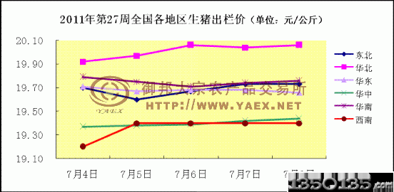 其中,東北生豬出欄均價為19.69元/公斤,與上周相比上漲0.34元/公斤、環(huán)比上漲1.76%;華北生豬出欄均價為20.01元/公斤,與上周相比上漲0.18元/公斤、環(huán)比上漲0.91%;華東生豬出欄均價為元19.68/公斤,與上周相比上漲0.12元/公斤、環(huán)比上漲0.61%;華中生豬出欄均價為19.40元/公斤,與上周相比上漲0.19元/公斤、環(huán)比上漲0.99%;華南生豬出欄均價為19.75元/公斤,與上周相比沒有任何變動;西南生豬出欄均價為19.36元/公斤,與上周相比上漲0.08元/公斤、環(huán)比上漲0.41%。