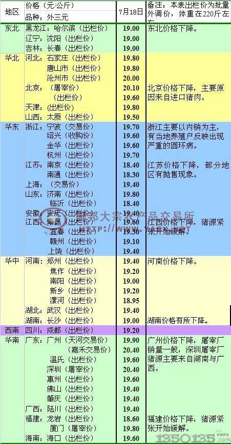 其中長沙、湘潭、株洲、郴州等地生豬出欄價19.00-19.40元/公斤,岳陽、益陽、常德、邵陽、婁底等地生豬出欄價18.30-19.10元/公斤,衡陽、永州等地生豬出欄價18.90-19.30元/公斤,7月18日全國生豬出欄均價19.29元/公斤,全國豬糧比8.31:1。其他地區(qū)生豬價格請見下表。