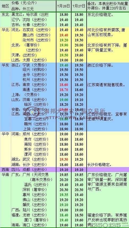 昨日全國生豬出欄均價基本穩定,其中東北本周以來一直維穩在19.20元/公斤,華北地區生豬出欄均價保持穩定,華北、華中、華南生豬出欄均價小幅下跌,江蘇南通有養殖戶出現拋售現象,受天氣炎熱,需求減少等影響,后期生豬價格將繼續企穩回落。