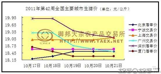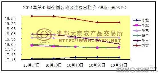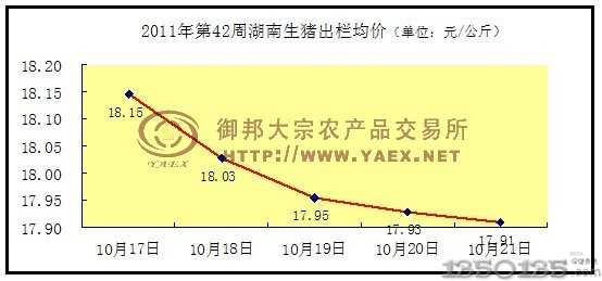 2011年第42周(10.17-10.21),本周湖南各地豬價仍保持下降趨勢,周平均價格為17.99元/公斤,與上周(18.81元/公斤)相比下跌1.02元/公斤、環(huán)比下跌4.35%。