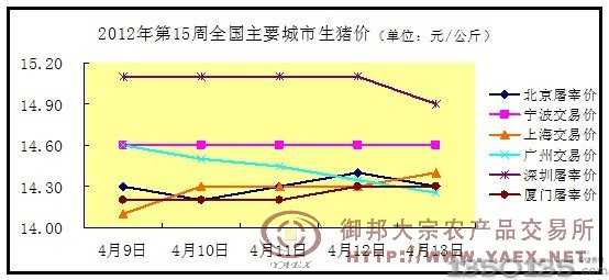 據(jù)本所監(jiān)測(cè),2012年第15周,湖南地區(qū)生豬出欄均價(jià)變化如下:
