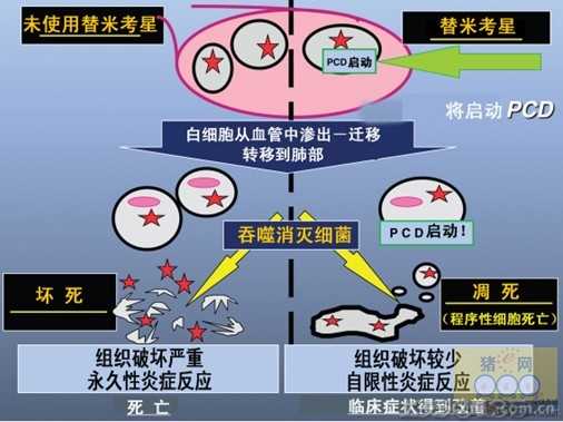 自2006年以來,高致病性的豬產生促進細胞凋亡及抗炎的效果。圖1大體描述了替米考星的此項特性,但其具體的作用機理有待進一步的研究。