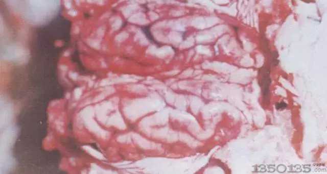 【豬偽狂犬病】軟腦膜充血,其下腦溝積有出血性水腫液