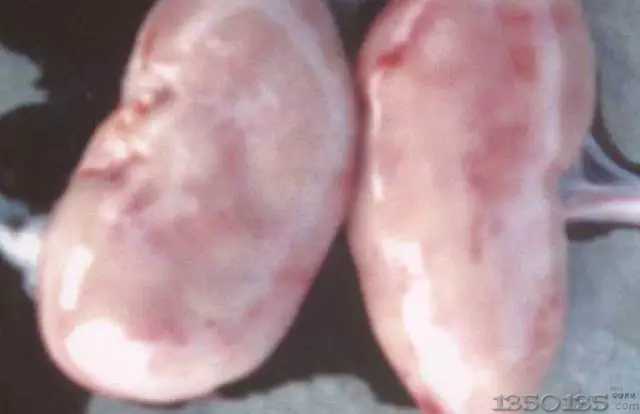 【豬偽狂犬病】腦膜明顯充血,腦脊髓液增加,屢見腎包膜下有點狀出血