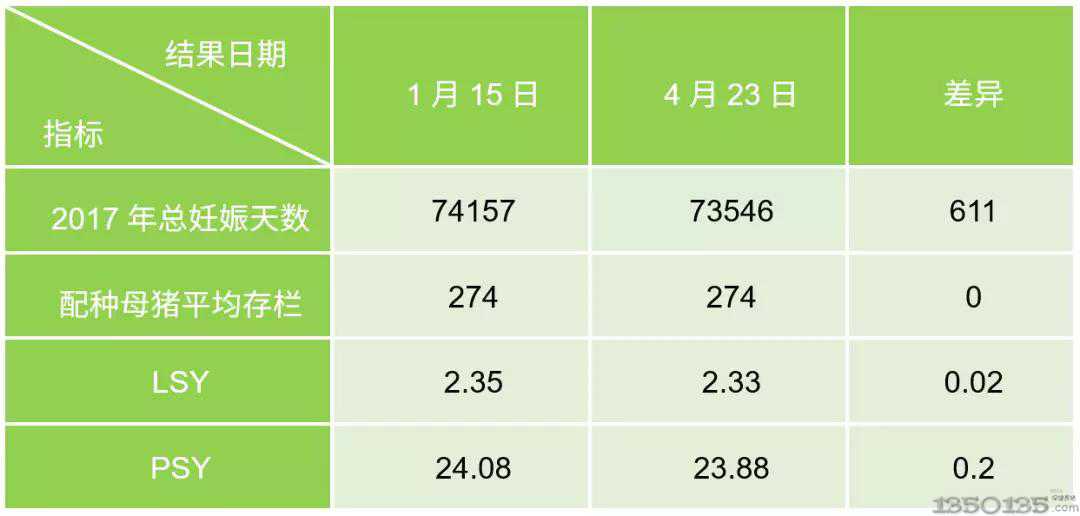 例如:某豬場2017年配種母豬平均存欄274頭, 2018年1月15日在豬知富™查看2017年總妊娠天數為:74157天, LSY為:2.35,PSY:24.08。2018年4月23日再看該豬場2017年總妊娠天數為:73546天,LSY:2.33,PSY:23.88。總妊娠天數減少611天,LSY減少0.02,PSY減少0.2 。
