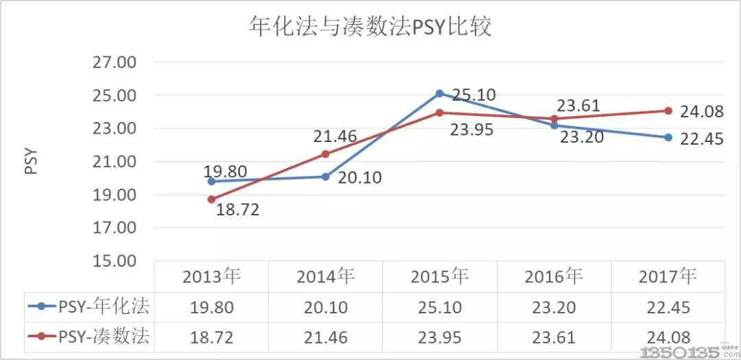 某6000頭母豬場,兩年的原始數據,共計35000多行,我分別用以上4種算法手動計算豬場PSY,匯總比較如下: