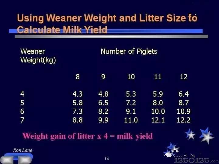 使用斷奶重和窩斷頭數來計算母豬泌乳量(窩增重X4=泌乳量)