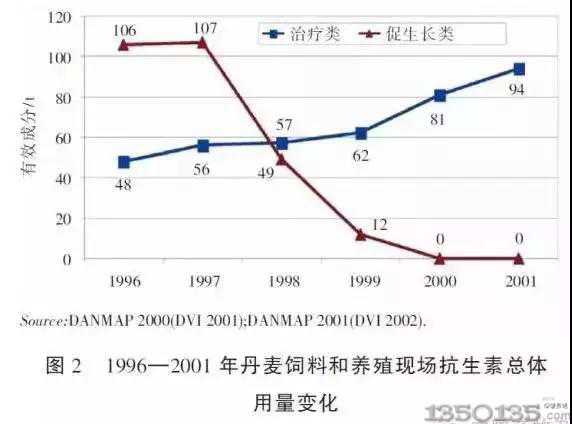 由圖2 可以看到,1996—2001年,丹麥現場處方用藥的年用量是不斷增加的,以有效成分計算,從48t增加到了94t(2001年);但飼料和養殖現場的抗生素總用量是降低的,從1996年的154t,下降到了2001年的94t。