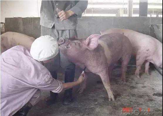 公母豬和中大豬:對準下針部位,使針頭偏向氣管約15度方向下針,拉緊針筒活塞,若扎中,可見血液流出。如果見不至血液流出,說明沒有扎中,有可能是前腔靜脈較深,可用手頂緊針筒,使針頭扎深一點。若仍采不到血,可以把針頭往后稍退,或左右搖擺針頭,直到有血液流出為止。實際上,操作熟練后,針頭有沒有扎中,憑手就可以感覺得到的,當針頭扎破靜脈壁時,可以感覺得到輕微的“卜”的一聲。