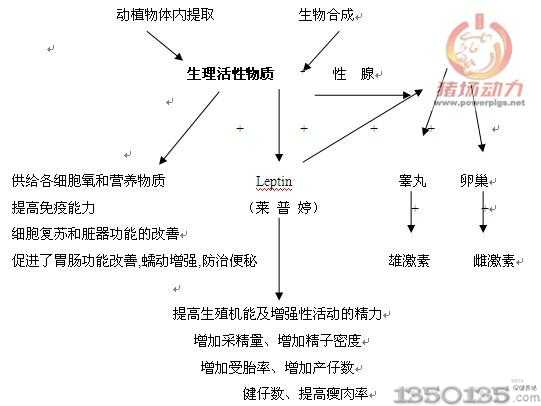 Leptin(瘦素)由動物脂肪細胞分泌,正常情況下具有降低脂肪含量和提高繁殖性能等作用,但由于某些動物體內可能存在Leptin抵抗(Leptin不能正常與受體結合),難于發揮作用。本研究配制的一種生理活性物質—Leptin生理激活劑(可從動植物提取或生物合成),可能改善動物體內Leptin抵抗,發揮內源Leptin生理功能,可顯著增加血雄激素水平,提高外來良種公母豬繁殖性能和產仔數。同時還可以改善心功能,增強體質,加速血液循環,供給細胞氧氣,增加細胞再生能力,分解及排出積聚于身體內的化學劑及重金屬等有害物質,隨糞便、尿液及汗水將體內毒素一起排出體外,另外能增強大腸蠕動,將積聚之廢物排出,減少便秘。這都將成為改善種公、母豬新陳代謝和控制育肥豬生長后期脂肪沉積,增加瘦肉產量的有效手段。