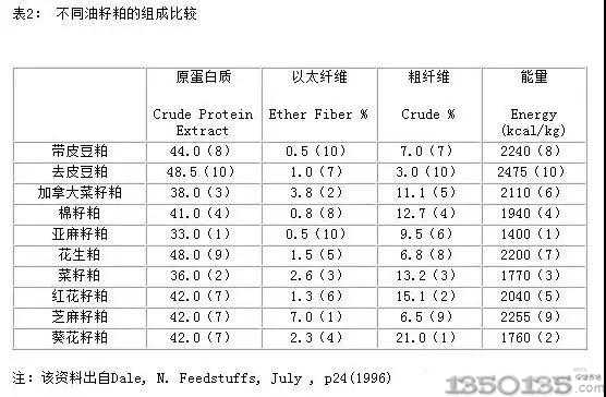 豆粕中含蛋白質43%左右,賴氨酸2.5%~3.0%,色氨酸0.6%~0.7%,蛋氨酸0.5%~0.7%,胱氨酸0.5%~0.8%;胡蘿卜素較少,僅0.2~0.4mg/Kg,流胺素、核黃素各3~6mg/Kg,煙酸15~30mg/Kg,膽堿2200~2800mg/Kg。豆粕中較缺乏蛋氨酸,粗纖維主要來自豆皮,無氮浸出物主要是二糖、三糖、四糖,淀粉含量低,礦物質含量低,鈣少磷多,維生素A、B、B2較少。表2反映的是豆粕與其他各種油粕的組成比較。