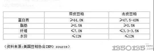 根據烘烤過程中是否攙雜進大豆種皮,豆粕還可分為帶皮豆粕和去皮豆粕,二者主要區別是蛋白質水平不同,具體指標見下表: