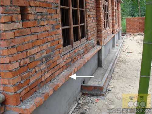 圖4 豬欄的側面是流水溝,上面50公分處的伸出半磚是準備走飲水管道的(白色箭頭所指),管道裝好后,掄一磚在側面,用沙把管道蓋住,防止冬天管道結凍,管道出現問題時修理也方便。