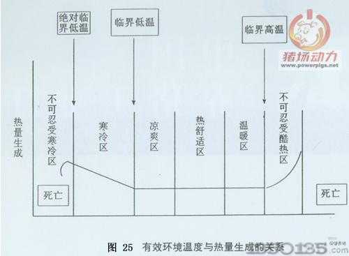 熱中性區,有時又叫做熱舒適區,是動物產生熱量最少的溫度區域。在此區內,豬不必要產生更多的熱量或依賴冷卻機制以保持舒適。當有效環境溫度降落到熱中性區的下界以下,豬便進入了涼爽區,在此溫區內,豬采用改變行為的方式以保持體溫。這些包括同圈的豬擠在一起,減少與傳導性表面如地板的接觸,以及采用盡量減少身體表面暴露的姿勢。涼爽區的下界被稱為臨界低溫。當溫度降落于臨界低溫之下,豬便進入寒冷區。這時豬的內分泌會發生變化以增加產熱率。如果溫度繼續下降,豬的代謝活動最終將達到最高(極端代謝)。環境溫度的進一步下降將最終導致死亡,因為豬已不再能維持自身的體溫。