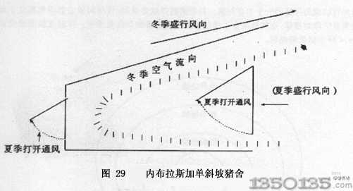 自然通風系統具有多種不同的形式,其主要的設計特點考慮下列因素:盛行風向的季節變化。曖空氣上升及利用煙囪效應造成的大氣壓差將空氣抽出屋外的物理原理。圖29中的內布拉斯加單坡面房子是自然通風的一個好例子。北半球的房屋座北朝南。在夏季將后窗打開,南墻也按一定角度打開使盛行的南風吹入,氣流穿過豬活動區就達到通風作用。在冬天則關閉后窗,盛行的北風從房頂吹過,在房頂的前緣造成低壓區,它具有抽出屋內空氣的作用。舍內豬產生的熱量使空氣變暖,暖空氣上升到屋頂的內斜面并沿著斜面向E最終向外流出。