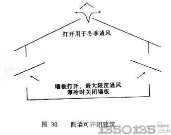 圖30是一個更傳統的建筑式樣,這種建筑具有兩個坡面的屋頂和可開閉的側墻,側墻可由塑料窗簾或者是具有鉸鏈的窗板覆蓋。同樣,房子的長軸應該與盛行風向垂直。在設計這種建筑時,特別要注意它的寬度和豬舍之間的距離。房屋過寬會妨礙空氣的有效移動使通風受到影響。如果空氣流動被鄰近房屋擋住的話,風速和通過能力將會降低,這兩個參數都取決于盛行風的強度,在建筑設計過程中應該咨詢當地專家。