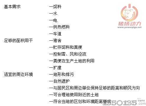 在考慮新建豬舍,或只是在現(xiàn)有設(shè)施的基礎(chǔ)上進行擴建和改建時,最重要的步驟首先是選好場址。規(guī)劃不周可導(dǎo)致整個設(shè)施在使用過程中,無論是豬舍的利用,還是周邊的利益都不盡人意。豬舍引起的任何氣味、蚊蠅或水的污染都會引起周邊單位的反對,甚至訴諸法律。選址應(yīng)考慮的因素包括: