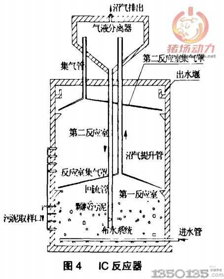 由于無法將污泥停留時間和水力停留時間分離,無法給甲烷菌提供良好的生長條件,只能依靠增大反心器的容積來提高污泥的停留時間,因此只適應生產規模較小的養殖場。第1代沼氣池主要有上流式厭氧污泥床反應器(UASB,圖3所示),它實現了污泥停留時間和水力停留時間的分離,使污泥停留時間可以長達上百天而水力停留時間可以縮短至兒小時,因此大大提高反應器的負荷,從而縮小了反應器的容積,可用于大型養殖企業的污水處理。第三代沼氣池主要是在第二代沼氣池的基礎上經過進一步的改進形成的,經過改進后的第三代反應器使廢水和反應器內的污泥更加充分的接觸,進一步縮短了水力停留時問,使反應器的占地面積更小,處理負荷更高。應用較為廣泛的第三代沼氣池主要是厭氧內循環反應器(IC,圖4所示)。