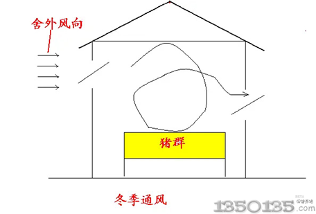 但在冬季必須注意,進(jìn)風(fēng)的窗戶要高,而且進(jìn)風(fēng)窗戶最好有一個(gè)斜向上的板,這樣可以引導(dǎo)冷風(fēng)氣先向上走,然后下沉,減輕對(duì)豬的傷害。如下圖:
