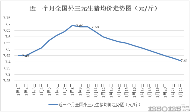 據豬場動力網“動力豬價”統計,今日全國外三元生豬均價為7.41元/斤,較昨日下跌0.02元/斤,從下述表格可以看出1月8日之前豬價一直處于上揚態勢,當時主要受到雨雪天氣影響。1月10日后豬價呈直線下跌,主要原因是雨雪天氣后各地生豬調運恢復,天氣利好因素不在,其次消費始終沒有出現大的波動,不足以豬價止跌上揚。