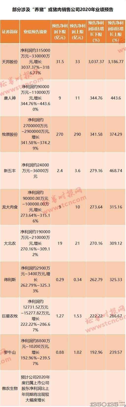 根據目前已經披露的養豬企業的業績預告,包括牧原股份在內,這些企業2020年業績普遍翻倍。