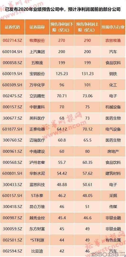 從目前已發布2020年業績預告的公司來看,牧原股份的預計凈利潤也居于前列,高于上汽集團、五糧液、寶鋼股份、萬華化學、立訊精密、中聯重科等公司。