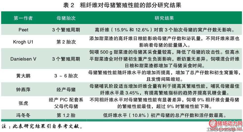 提高母豬的繁殖性能是營養調控上的一個熱點,已經有很多關于粗纖維對母豬繁殖性能影響的報道,見表2。