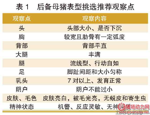 商品豬場(chǎng)后備母豬引種更多地是依賴于對(duì)后備母豬表型性狀而決定選擇與否,表型選擇是養(yǎng)殖者通過多年養(yǎng)殖經(jīng)驗(yàn)經(jīng)過歸納總結(jié)得出的系統(tǒng)性選擇方案。引種人員很難判斷種豬企業(yè)所提供的生產(chǎn)性能記錄真實(shí)性,就目前的養(yǎng)殖現(xiàn)狀,表型選擇是對(duì)后備母豬選擇較為有效的依據(jù)。表1為后備母豬表型選擇的推薦觀察點(diǎn)。