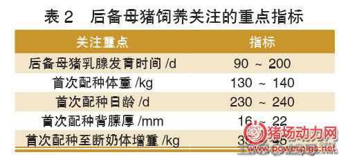 所有的豬場(chǎng)對(duì)后備母豬健康度重視程度較高,都會(huì)及時(shí)采用合理的保健方案或?qū)τ袉栴}的個(gè)體進(jìn)行針對(duì)性治療,反而對(duì)后備母豬是否達(dá)到配種條件容易忽略。后備母豬主要關(guān)注重點(diǎn)詳情見表2:1)能否保證乳腺發(fā)育正常;2)配種時(shí),母豬是否已經(jīng)達(dá)到體成熟)3)配種時(shí)體儲(chǔ)能否滿足首個(gè)繁殖周期需要。