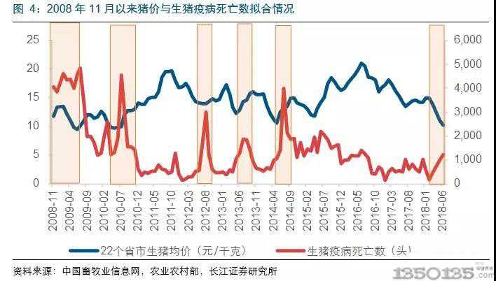 疫情對(duì)短期豬價(jià)的影響主要體現(xiàn)為助漲助跌。將2008年以來(lái)豬價(jià)與生豬疫病死亡數(shù)(農(nóng)業(yè)農(nóng)村部統(tǒng)計(jì)的豬瘟、高致病性豬藍(lán)耳病、豬繁殖與呼吸綜合征、豬囊蟲(chóng)病、炭疽、豬丹毒、豬肺疫、布魯氏菌病這8種疫病的合計(jì)死亡數(shù))進(jìn)行擬合,可以看到2009年上半年、2010年7月、2012年8月、2013年7月、2014年7月和2018年6月全國(guó)疫情嚴(yán)重,生豬疫病死亡數(shù)高,而在重大疫情發(fā)生后中,豬價(jià)仍按照原來(lái)的趨勢(shì)在變化,疫情主要起到助漲助跌的作用。