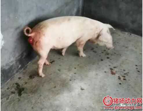 輕者在臥地時或排糞尿后,直腸黏膜脫出肛門口,發生紅腫。起立后可縮回。嚴重時直腸脫出呈半球狀或圓柱狀,暗紅色,表面水腫污穢,甚至破口出血、結痂。若伴有直腸或結腸套疊時,脫出的腸管較厚而且硬,可向一側彎曲,病豬頻頻努責,做排糞姿勢,伴有明顯的全身癥狀。